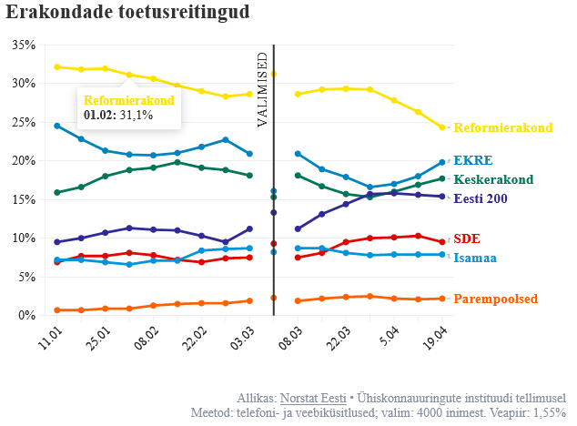 Lisan siia veel ühe anomaalia, viidates taas Norstati küsitlustulemustele. Graafikult on selgelt näha, kuidas 2023. aasta märtsis hüppas teatud erakondade toetus just valimiste ajaks üles ja teistel samal ajal kukkus. Peale valimisi aga taastus endine toetusprotsent, nagu midagi poleks juhtunudki.