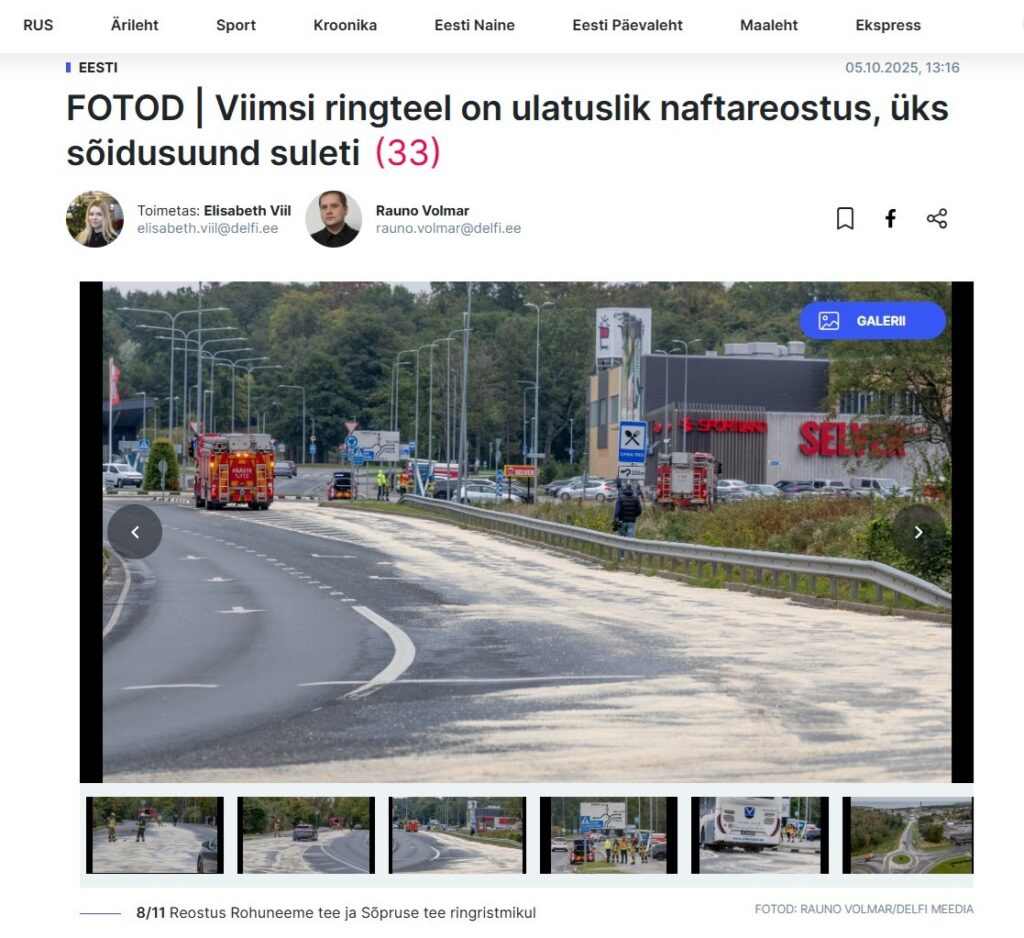 “Sündmusele reageerinud päästemeeskond tuvastas, et alates Sõpruse tee ja Rohuneeme tee ringristmikust kuni Kaluri teeni on asfalt kaetud naftasaadusega. Päästeameti sõnul tekitas naftareostuse ilmselt suurem veoauto. Päästjad alustasid reostuse likvideerimistöödega.