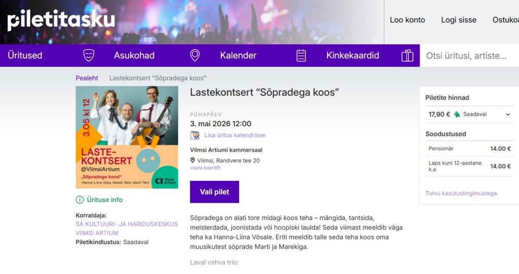 Tunnuspilt: kuvatõmmis Piletitaskus pakutavatest piletihindadest Artiumi lastekontserdile.